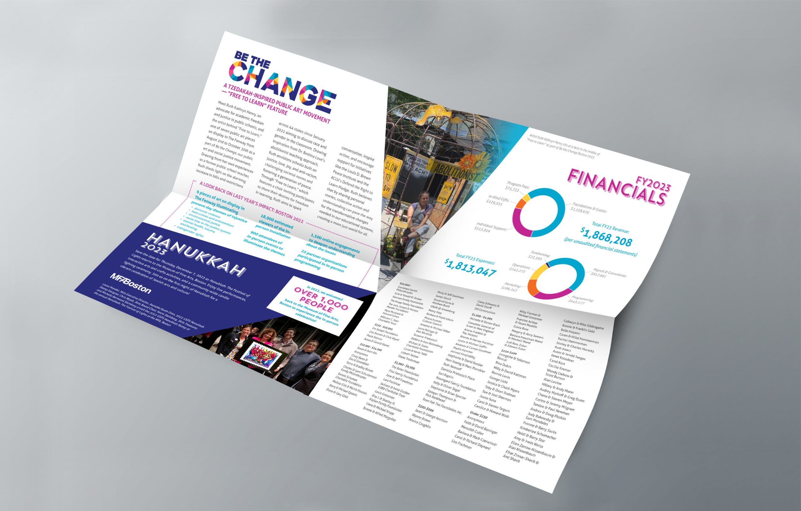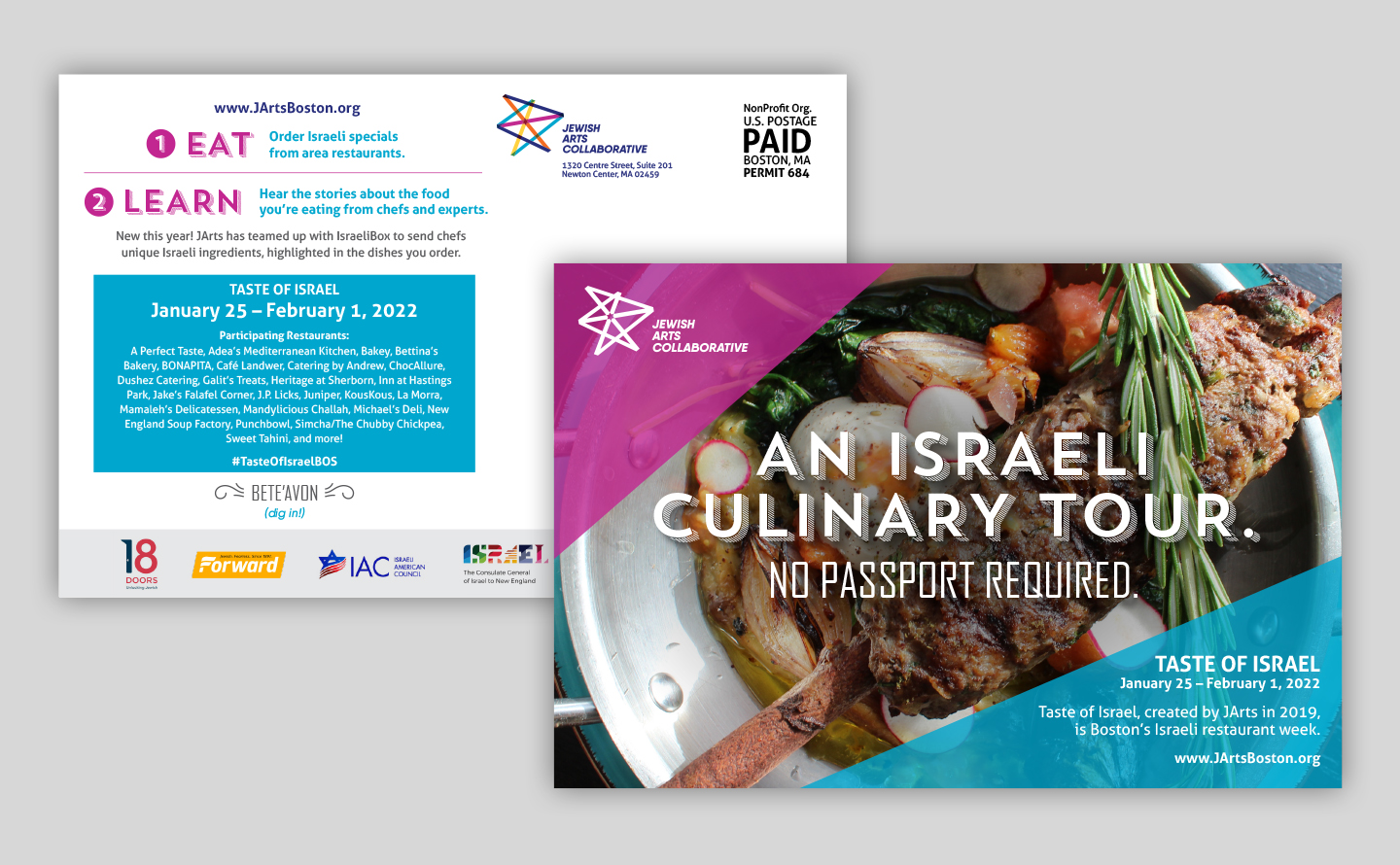 The Jewish Arts Collaborative is a Boston-based non-profit charged with bringing Jewish arts and culture to the greater population of Boston through free performances, installations, and art exhibits around the area. They had recently undergone a logo re-design and brought me on in order to push a new, bolder design aesthetic throughout their print materials, which including their quarterly printed magazine, a variety of postcards, and annual impact reports. Below is a smattering of the work I was able to do for them.