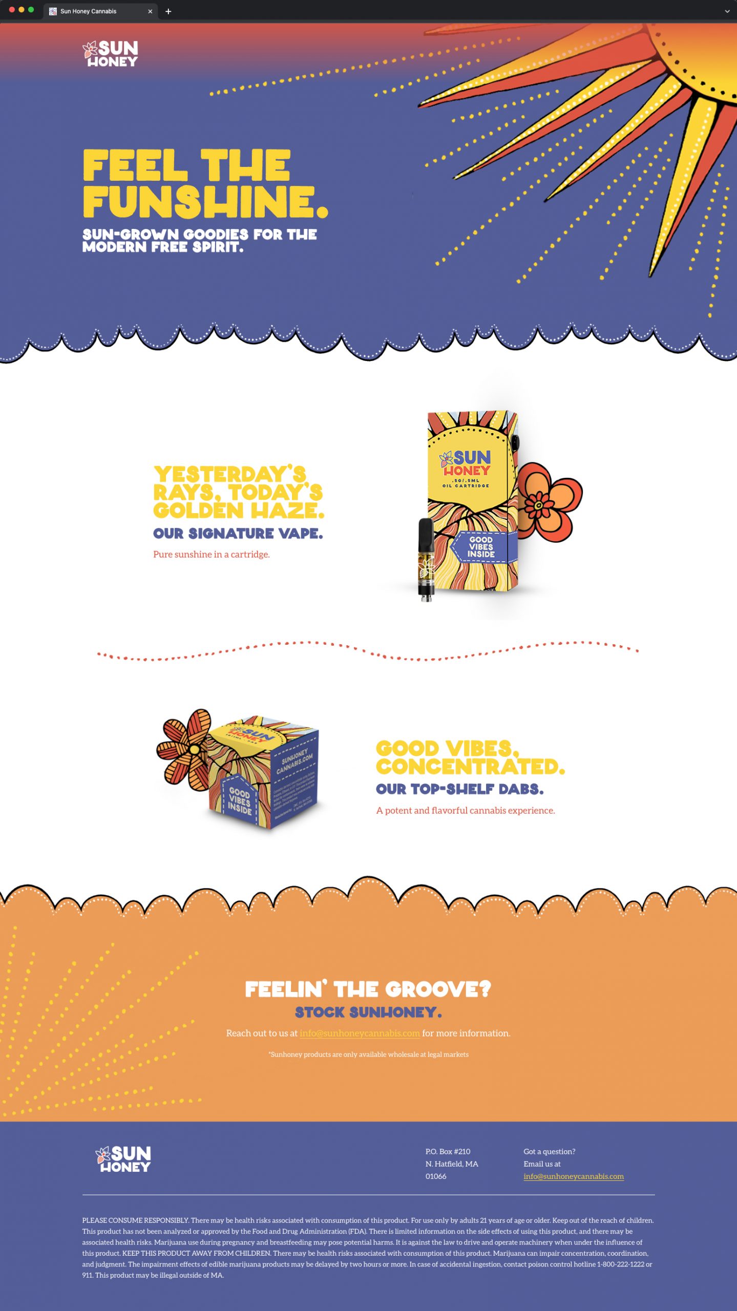After Cannabis was legalized in Massachusetts, a company came to our team requesting help with branding their new family of products. Beginning with a naming exercise, we extensively researched and landed on SunHoney Cannabis, a chill but upbeat brand that stood out from the crowd in both quality and personality.